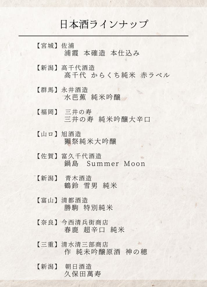 - 新オープン記念。希少銘柄含む日本酒10種類を飲み放題含むコースを破格で楽しめる会員を募集