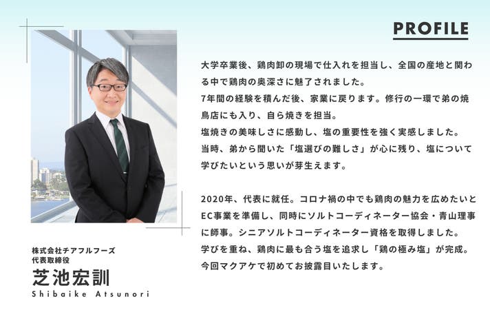このたびMakuakeを通じて、私たちのこだわりの鶏肉とそれを引き立てる塩を一般のご家庭でも楽しんでいただけるよう、このプロジェクトを立ち上げました。これをきっかけによりたくさんの方に国産鶏肉の持つ美味しさを知っていただけたらと思っております。