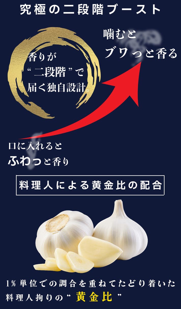 - 口の中で弾けるにんにくの香り!口の中で段階的に香りがくる斬新なスパイス