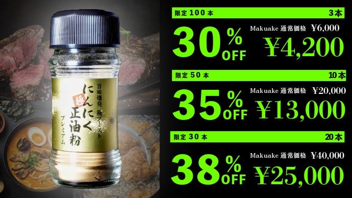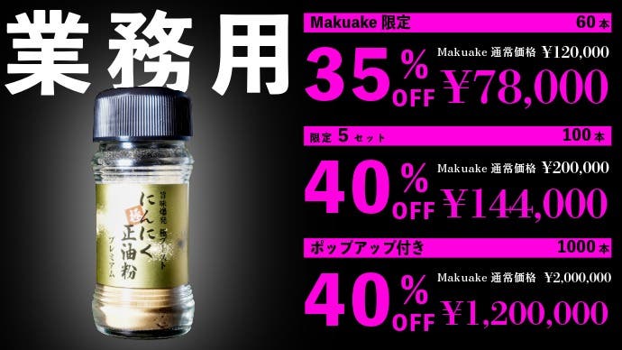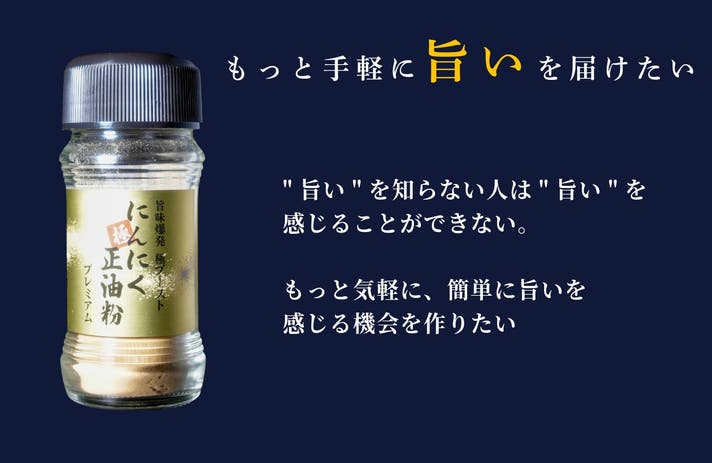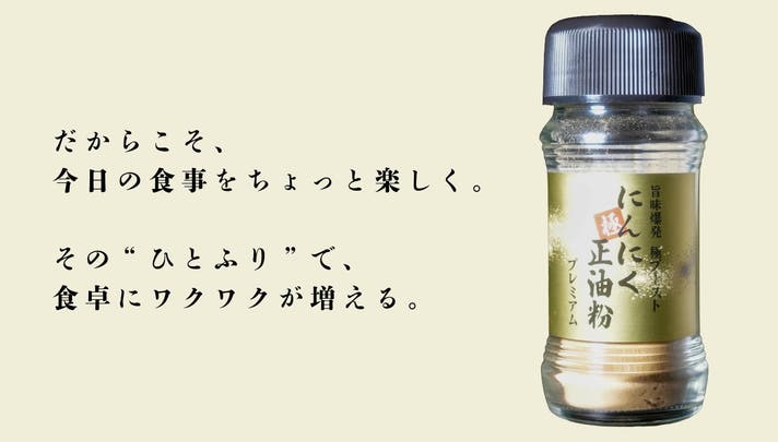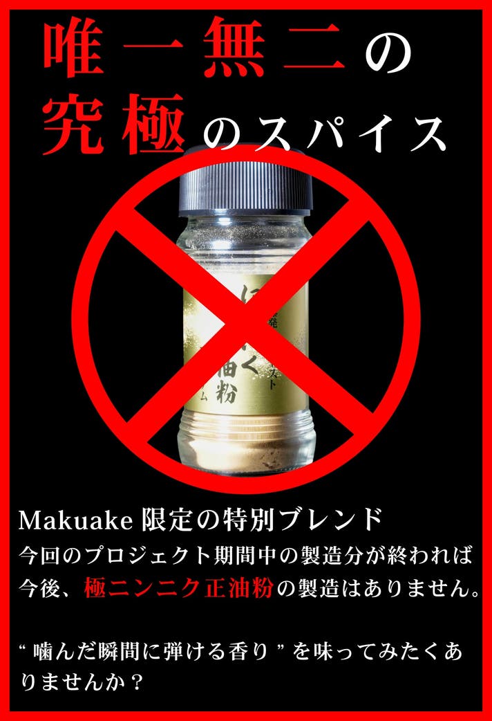 - makuake限定販売のオリジナル配合+ブースト機能をつけた新感覚のにんにくスパイス