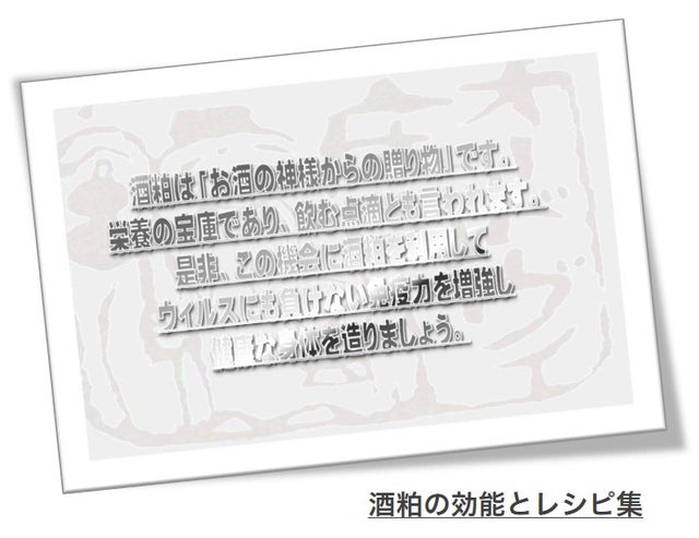 更に、酒粕の効能と利用方法を説明した資料をお付け致しますので是非、この機会に酒粕をご利用されまして、健康増進にも取り組まれ、この混乱時に通常にも増して素敵な「マイお酒ライフ」をお過ごし下さいますよう、心よりお願い申し挙げます。