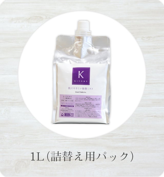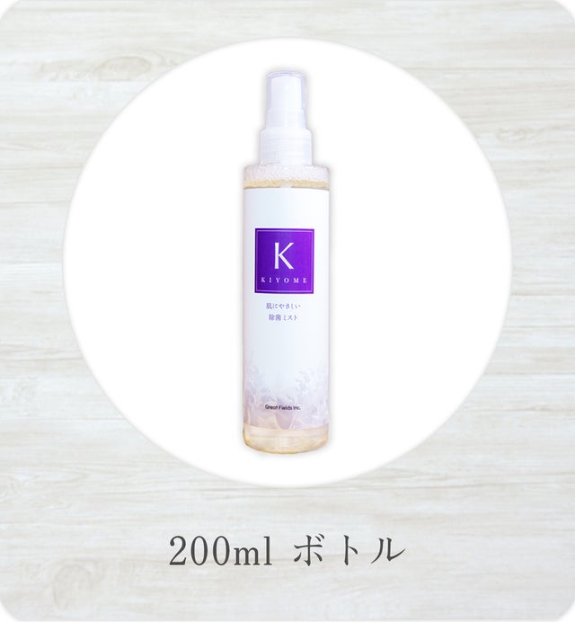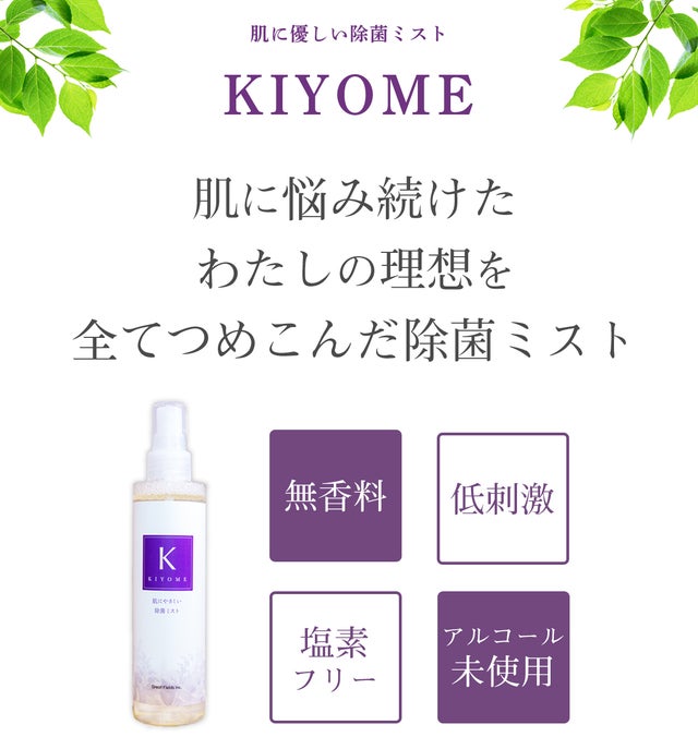 「KIYOME」は、やさしさを徹底的に考えた処方で、植物エキス・天然成分・保湿成分をふんだんに配合し、除菌したものや関係するもの、環境にも、刺激が少なく、除菌後も気持ちよくご使用いただくことを目指して開発しました。