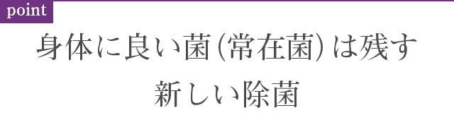 既存の除菌剤は、除菌力が非常に強く、身体にとって良い菌(常在菌など)まで一緒に除菌してしまいます。そのため、過剰な除菌によって、免疫力が低下し、健康を損ねてしまう懸念があると言われています。
