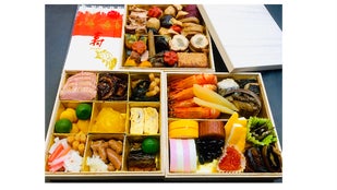 - 三人の板前が産地直産の食材をふんだんに使用し40種類以上の品が入った贅沢おせちをご家庭に。
