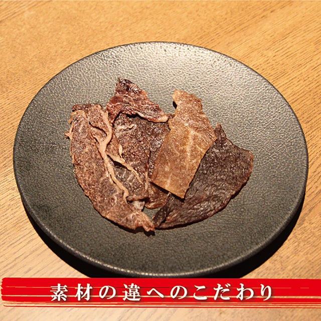 元来、保存食であるビーフジャーキーは、通常、肉の切り落としや切れ端の部位を使用します。このビーフジャーキーは、精肉店のショーケースに並ぶ肩ロースやモモなどの部位を、ステーキ肉やしゃぶしゃぶ肉のように丁寧に手で切り分け、乾燥・味つけの加工をおこなっております。