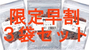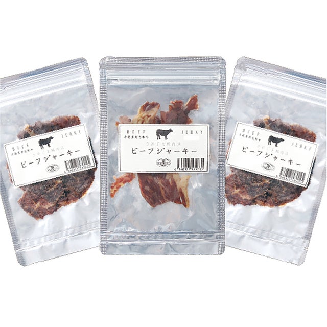 完成したビーフジャーキー「タンサキ」「トウガラシ」「肩ロース芯」ジャーキー3種類を真空パックの状態で(各20g/1袋)1袋づつ合計3袋お届けします。