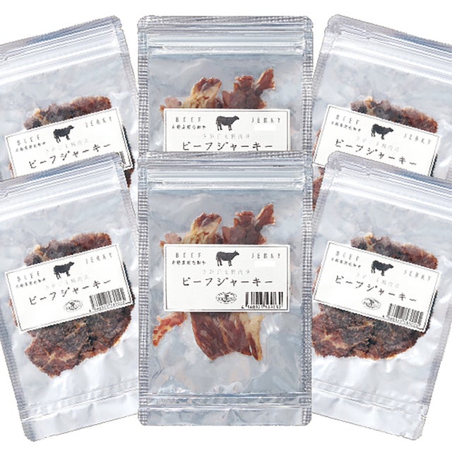 完成したビーフジャーキー「タンサキ」「トウガラシ」「肩ロース芯」ジャーキー3種類を真空パックの状態(20g/1袋)で2袋づつ計6袋のセットでお届けします。