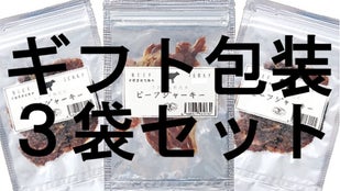 完成したビーフジャーキー「タンサキ」「トウガラシ」「肩ロース芯」ジャーキー3種類を真空パックの状態(20g/1袋)で1袋づつ合計3袋をギフトパックでお届けします。