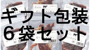 完成したビーフジャーキー「タンサキ」「トウガラシ」「肩ロース芯」ジャーキー3種類を真空パックの状態(20g/1袋)で2袋づつ合計6袋をギフトパックでお届けします。