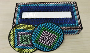 手作りエコティッシュボックス&コースターのセット、お礼状、オリジナルステッカー