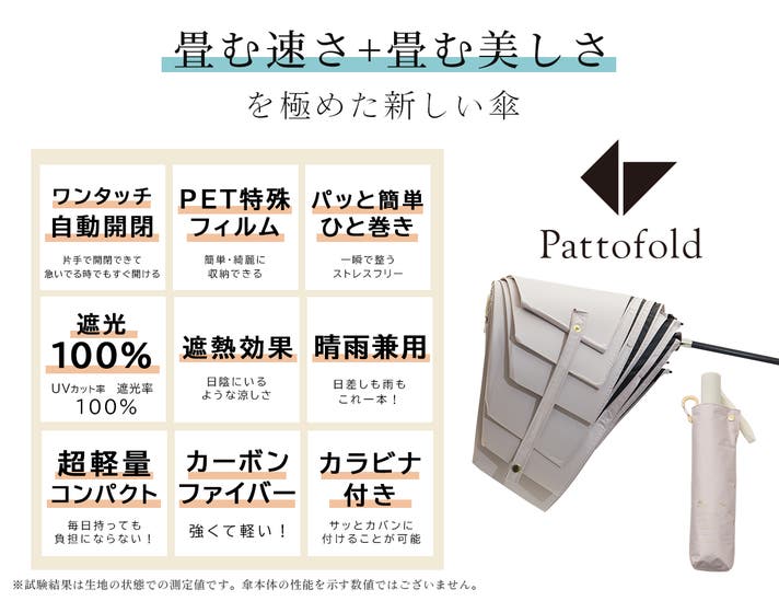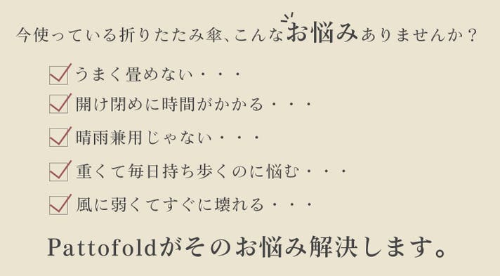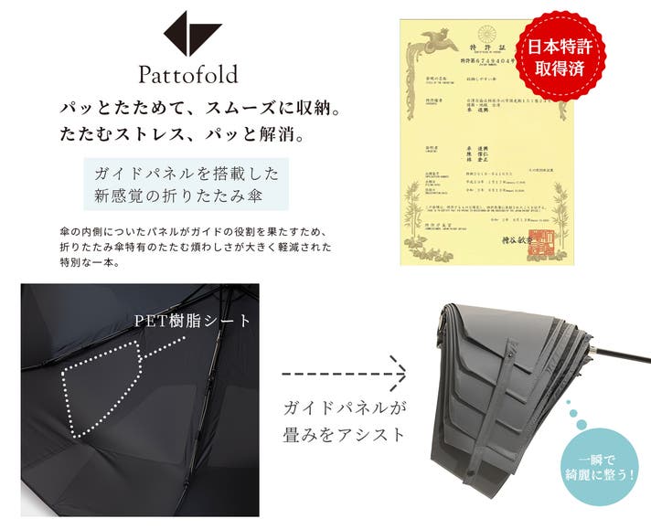 今回は、昨今の日本の気候より「晴雨兼用」で使えることはもちろんのこと、さらにスマートな快適さを皆様に実感いただきたいという思いから、使いやすさ・持ち運びやすさにこだわった「Pattofold」が誕生いたしました。
