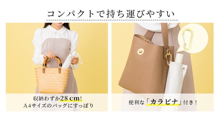 収納時は約28cmとコンパクトな長さなので、バッグにもすっぽり入ります!カラビナ付きでサッとバッグに引っかけられるのも嬉しいところ!