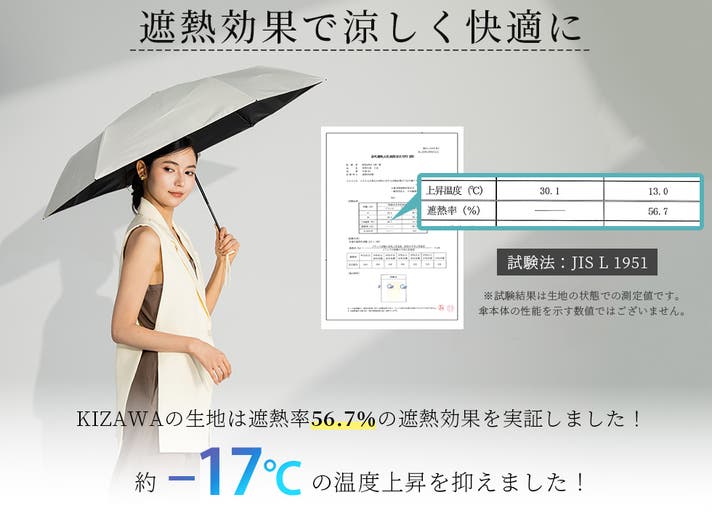 ※試験結果は生地の状態での測定値です。傘本体の性能を示す数値ではございません。