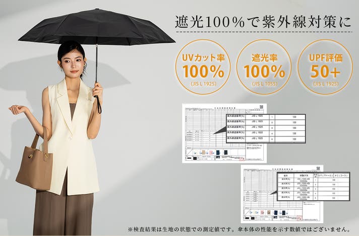 一財)日本繊維製品品質技術センターにて試験を行い、「遮光率100%」「UVカット率100%」「UPF50+」「遮熱率56.7%」を測定、確認済みの生地を使用した日傘!