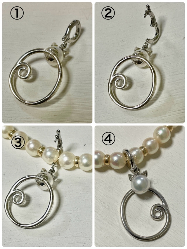 ペンダントはヘッドがバネの開閉式になっておりますので、チェーン、パールネックレス、リボン、太さのある物(幅約5mmくらいまで)などに取り付けられます。