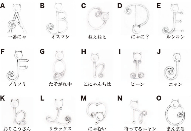 アルファベット26種に猫の動きを取り入れたデザインは、時間をかけて何度もデザイン起こし試作を繰り返し、3年という年月を費やしてようやく完成した完全オリジナル。アルファベット26種は全て異なる動きをモチーフにしています。