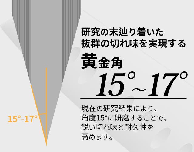 ナイフの黄金角とみなされる15°~17°の刃先角度は、さまざまな素材に対して効果的&効率的な切り込みが可能となります。