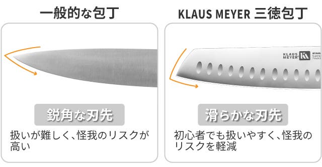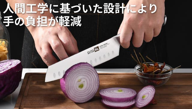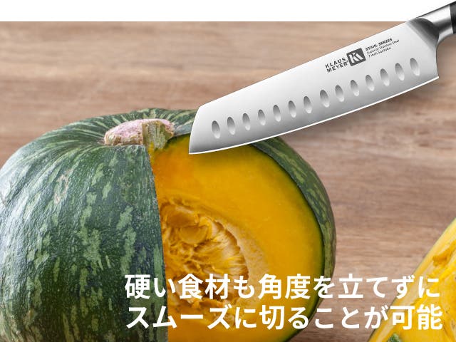 この包丁は、かぼちゃやスイカなどの硬い食材を切る際にも、角度を立てずに簡単に切ることができる設計の刃先のため、よりスムーズに料理ができるようになります。
