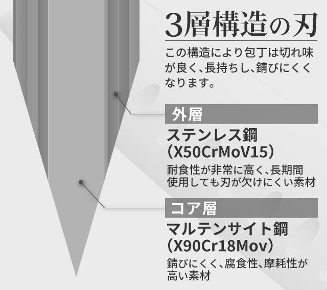 シェフナイフにはトリプルプライ技術が採用されており、これは「サンドイッチ」によく似ています。つまり、刃が3層になっているということです。外側の2層は低炭素ステンレス鋼で、腐食や錆に強いため、コア層、つまり「サンドイッチ」の「肉」は、高炭素X90Cr18Movで腐食や錆から守られます。
