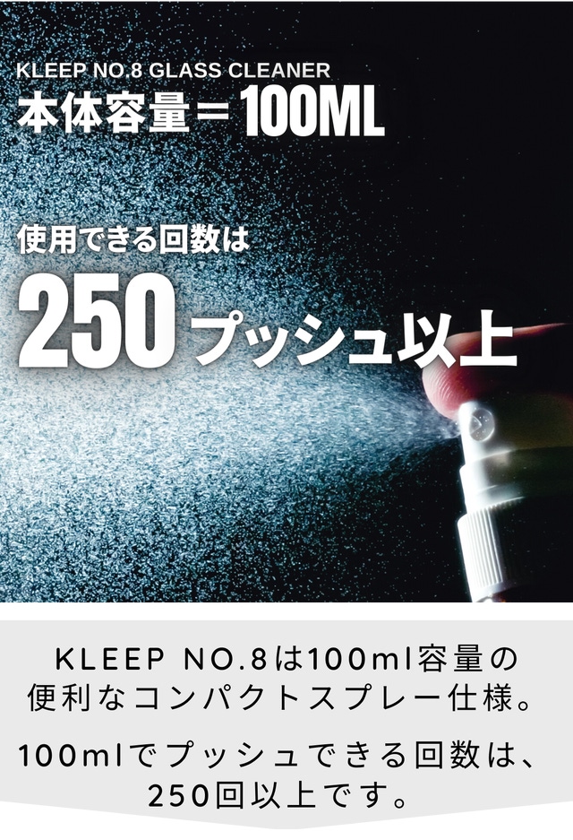今回ご紹介する「KLEEP NO.8」 はプロ仕様の窓ガラスクリーナーです。スプレーして拭くだけで簡単にガラス面を綺麗にでき、しかも拭き筋を残しません!プロの現場で使用されてきた確かな品質を是非お試しください。