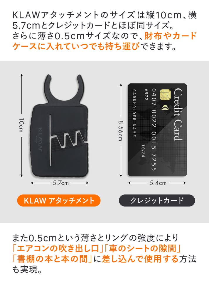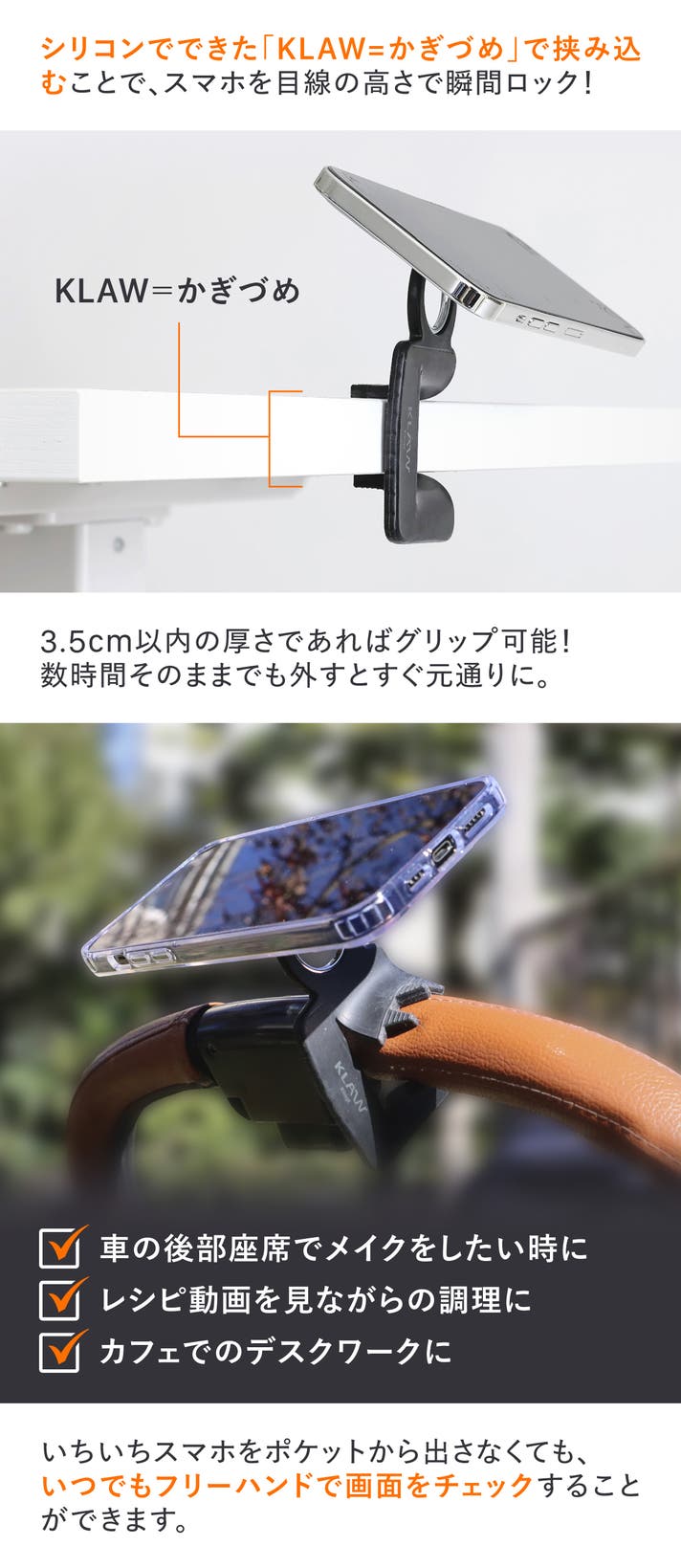 A:3センチまでの厚さであれば問題なく挟み込めます。素材はシリコン製のため、“鉤爪”の部分はしなやかで外すとすぐに元に戻ります。