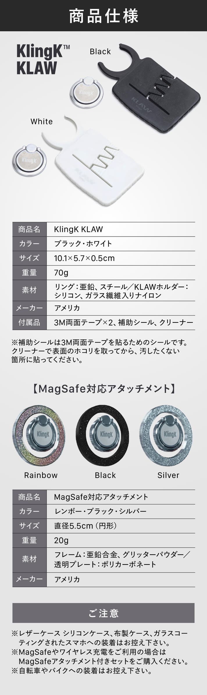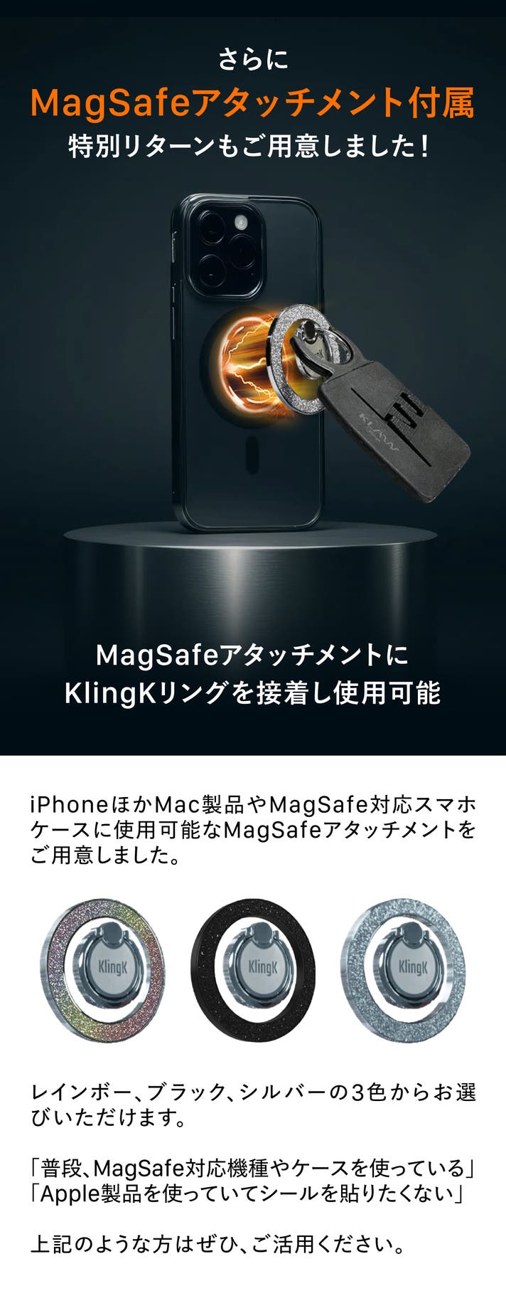 - 【着脱自在】ホルダーを外せばシンプルなスマホリングに。Magsafe対応アタッチメントあり