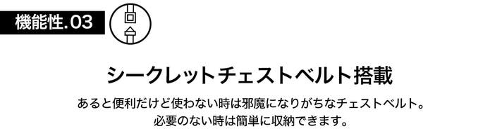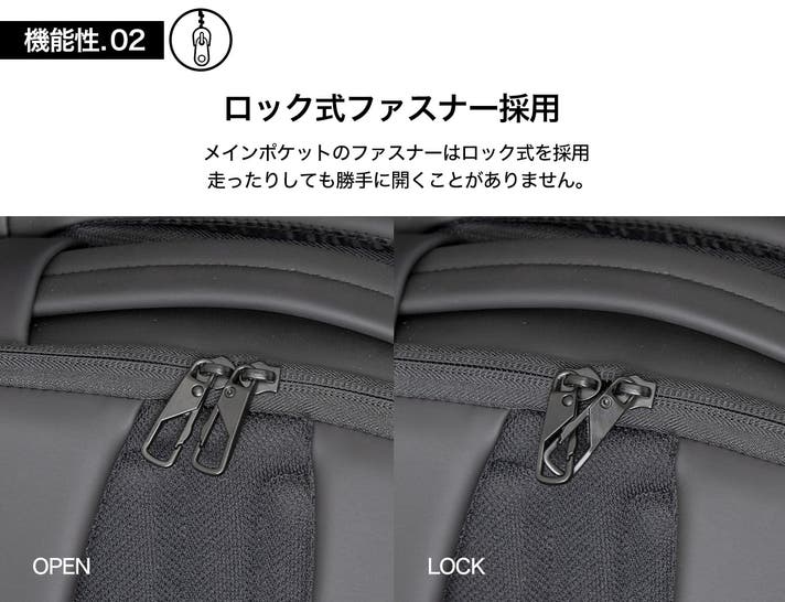 今回は都市での生活に便利な機能や付属アイテムをさらに充実させました。地下での移動で扱いに困る傘を掛けられるフックを搭載し、リュックを前に持っても後ろに抱えてもスマートに傘を収納できます。