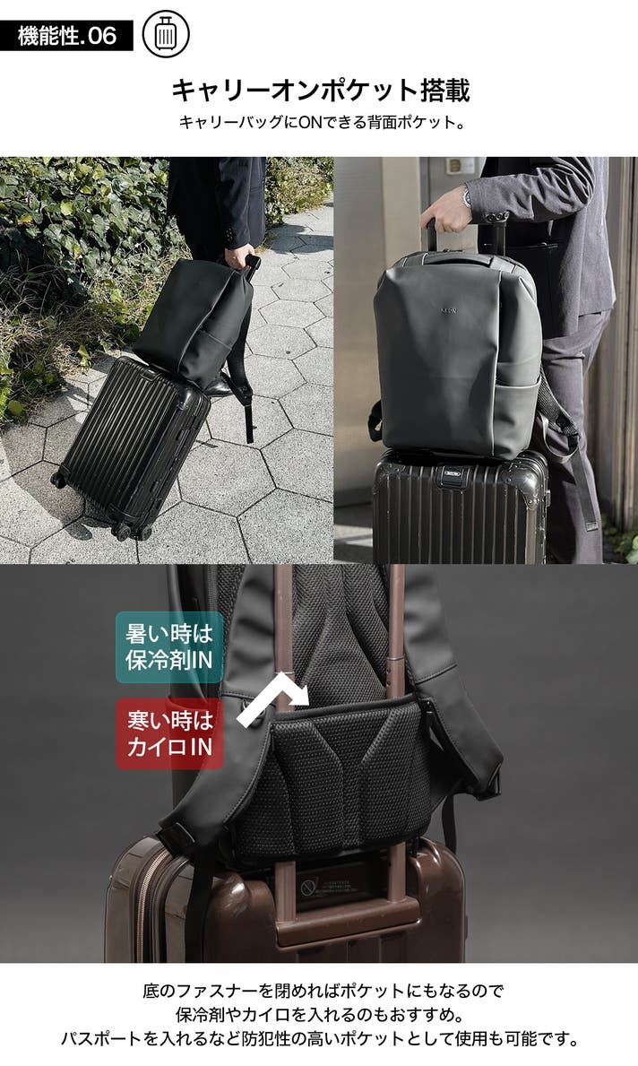 またデザインももちろんですが、街の移動時に邪魔にならない適度なサイズ感、見た目(サイズ)もスマートである必要がありました。狭い通路、狭いカフェで荷物がかさばることはスマートではありません。満員電車でリュックを前に持っても圧迫のないサイズ感とは...わたしたちは、数百回以上、バッグにPCや小物の出仕入れを繰り返し、最適なサイズと、最適なポケットの配置を検証しました。