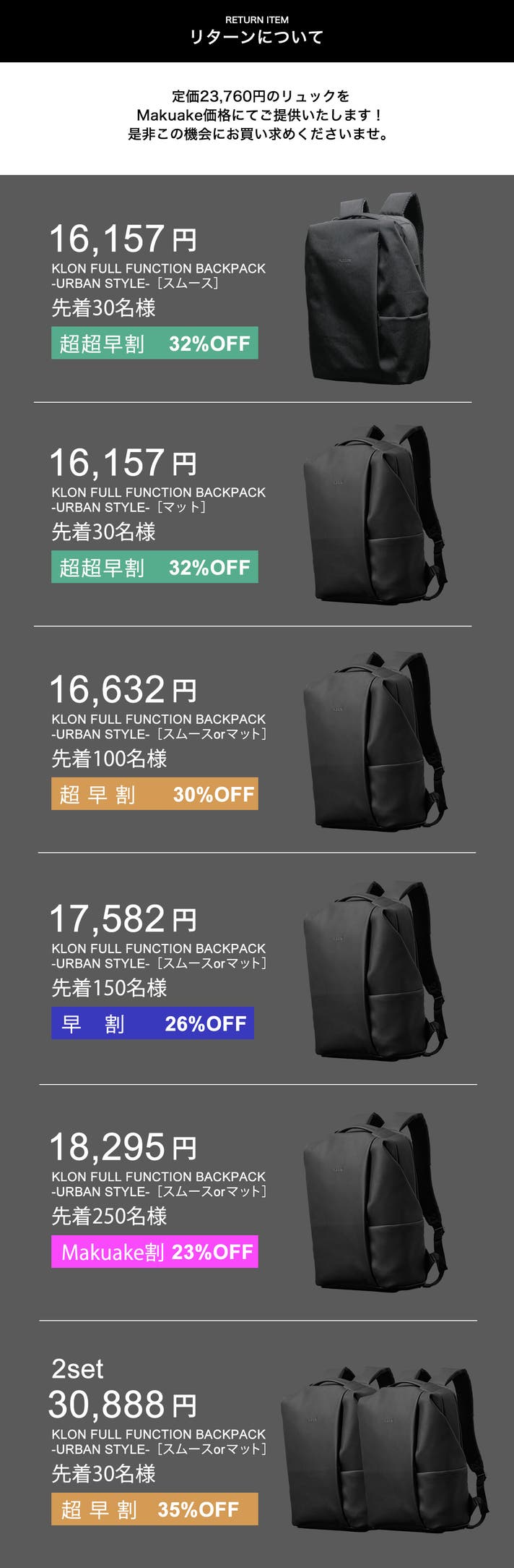 【Makuake割】KLON BACKPACK×1点(スムースorマット選択)