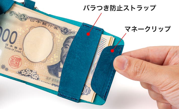 お札が落ちないように端には革のマネークリップをつけています。またお札をバラけないように、「ONE and」をくるくる巻きやすくするためにストラップでお札を抑えるようにしています。