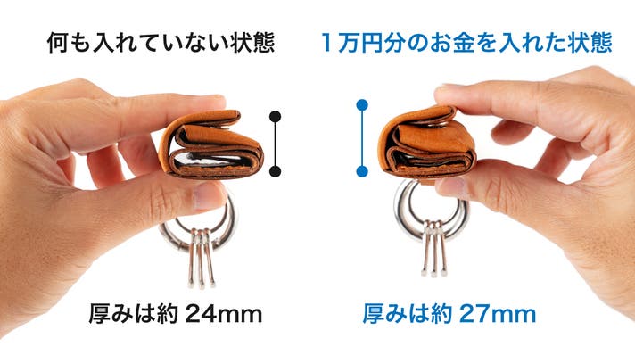 何も入れていない状態から、お札5枚・小銭16枚の1万円分のお金をいれても厚みは約3mmしか膨らみません。※革の硬さなどの個体差により多少前後します。