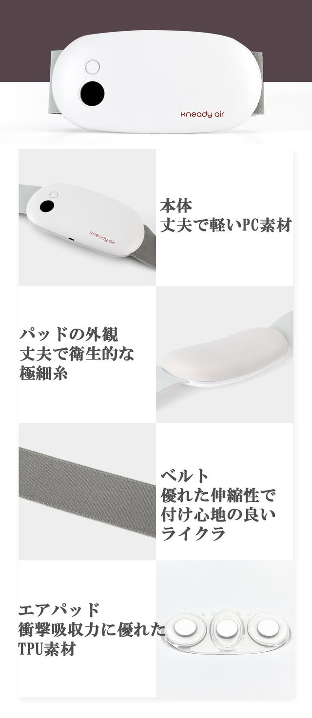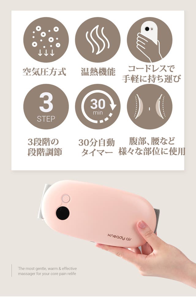 ニディエアは空気圧方式でやさしく柔軟にさすってくれる機器です。お腹、背中に使用でき、55度まで上がる温かい温熱機能があり、徐々に体を温めてくれます。軽くてかわいいデザインにワイヤレスタイプであるため、いつでもどこでも気軽に持ち歩きながら使用するのもおすすめの製品です!