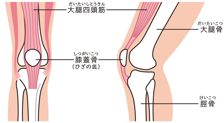 膝蓋骨は、膝を伸ばす際の、太ももの表面にある大腿四頭筋という筋肉の収縮をうまく脛骨(すねの骨)に伝えるための、いわば滑車のような役目を担っています。