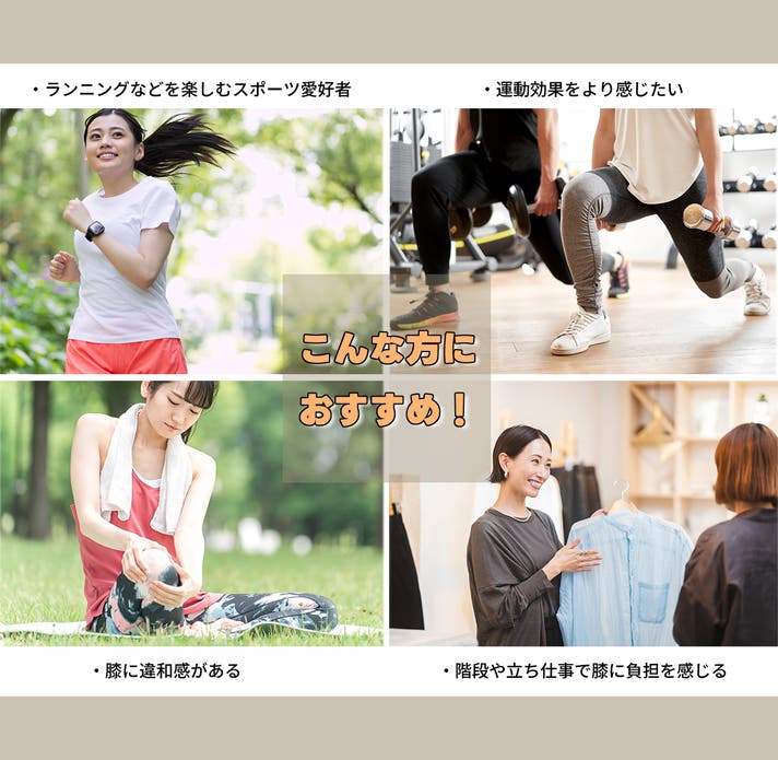 - 膝の皿(膝蓋骨)を正しい位置で安定させ、足運びを前へ!姿勢をサポートし、美しい歩行へ導く