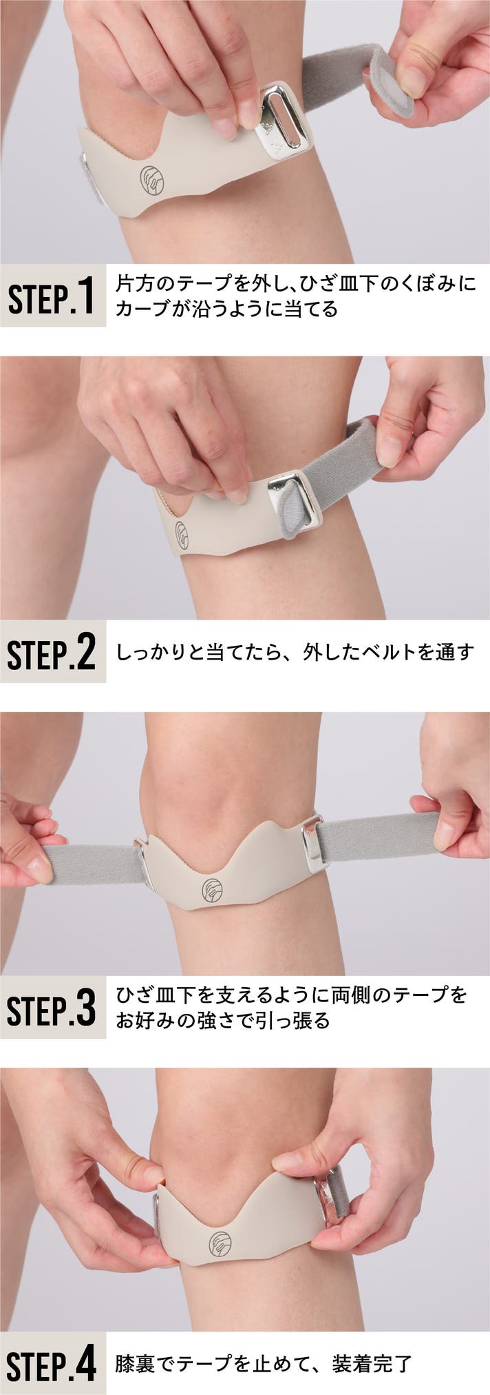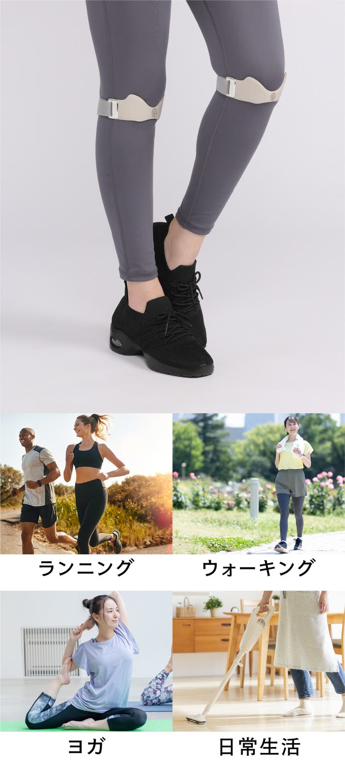 本商品を装着するだけで膝蓋骨(しつがいこつ)の安定をサポート。装着後、調整も簡単なので、ウォーキングなどの運動や、買い物などのお出かけでも使用可能です。