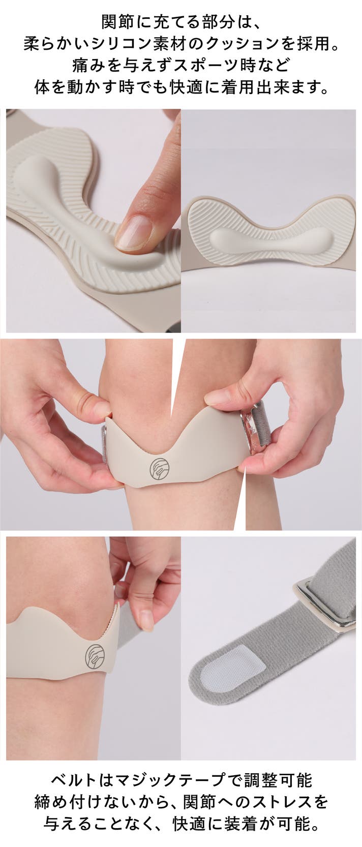 - アジャスト付きで自分の膝の皿(膝蓋骨)にシリコン製のエアクッションが優しくフィット