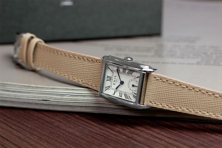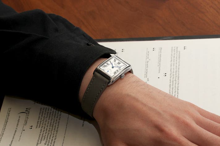 スモールセコンドはヴィンテージウォッチでよく見られる意匠。レクタンギュラーに配されると、文字盤の表情を豊かにし、一層の上品さと知的さを演出します。