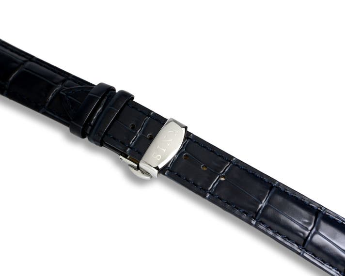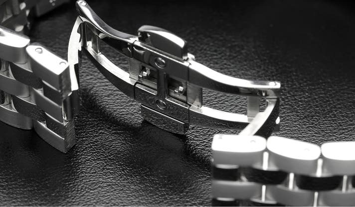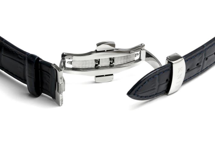観音開きタイプのDバックルは、見た目が美しく高級感漂います。高級時計のレザーストラップに限って使われるDバックルを装備することにより、着脱のストラップへのダメージを抑えつつ、滑落を防ぐ事ができます。
