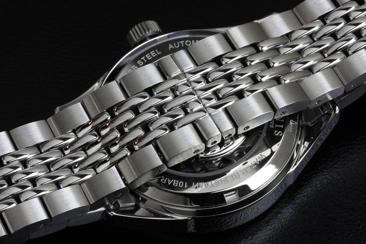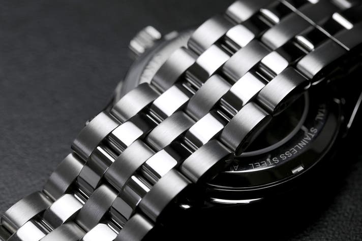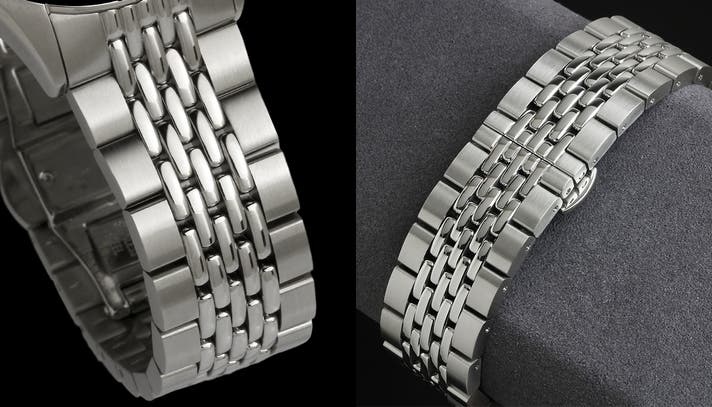 ヘアライン仕上げとポリッシュ仕上げを組み合わせることにより、奥行きのある質感を生み出し、エレガントさに磨きをかけています。