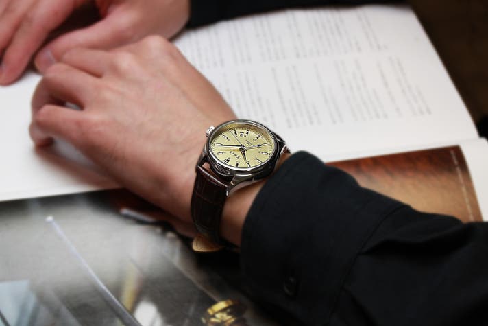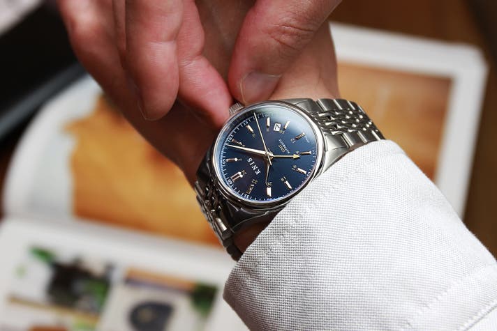 GMT針は文字盤上で独立して動き、ローカルタイムとホームタイムを直感的に把握できます。クラシックな丸型ドレスウォッチのデザインにGMT機能を組み込むことで、見た目の美しさと実用性の両立を実現しました。機械式であるため、毎日の巻き上げや時刻調整を通して時計との「対話」を楽しめるのも大きな魅力です。
