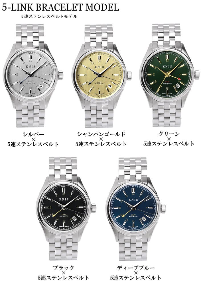 ・KNIS 日本製 クラシックGMT 腕時計 5連ステンレスベルトモデル×1本