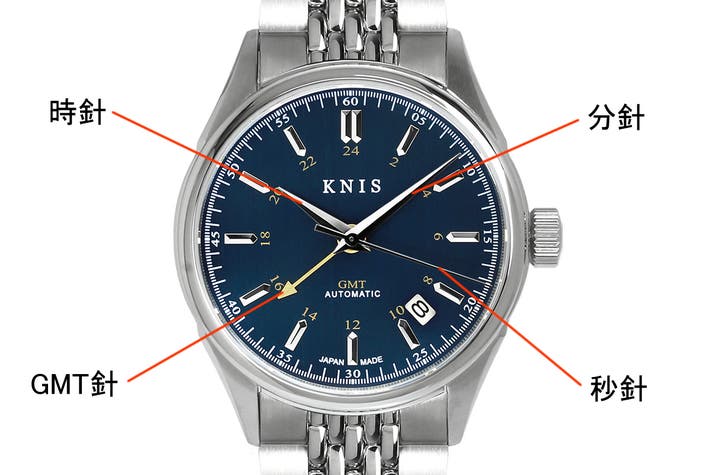 GMT(グリニッジ・ミーン・タイム)機能は、2つの異なる時間帯を同時に表示できる機能です。通常の時分秒針に加えて、24時間で1周する専用の針(GMT針)があり、第2のタイムゾーンを確認できます。