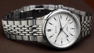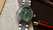 砲弾型のアプライドインデックスや、ドルフィン針の組み合わせが、クラシックウォッチとしての確かな存在感を引き立てます。さらにヘアライン仕上げのダイヤルがクラシックな雰囲気をより一層演出しています。