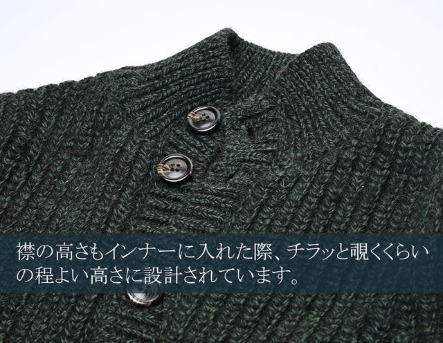 ハイネック仕様のスタンドカラー(立ち襟)は、通常のVネックカーディガンよりも上品で大人っぽい印象に映ります。