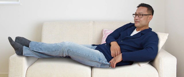 見た目と違い、着心地はカーディガン。室内では、こんなにゆっくりくつろげます。※写真はジャケットのみ着用(ハイネックセーター無し)