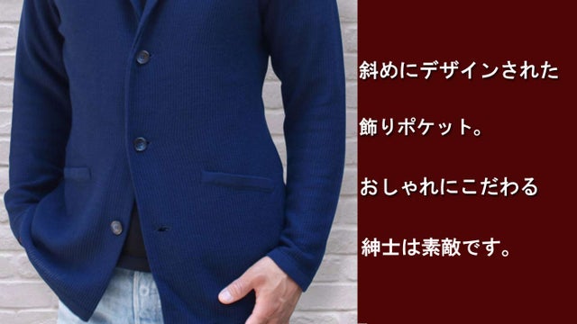 ニットカーディガンのポケットって、モノを入れると伸びてしまい、見た目がかなりかっこ悪い。ならばもう、デザイン性に特化して何も入らない飾りポケットにしました。斜めに配置した飾りポケットが、おしゃれ感が漂う素敵な紳士を演出します。