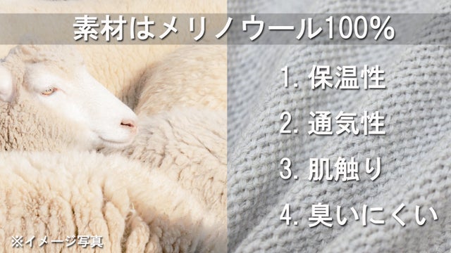 (注)保湿性、通気性、肌触り、臭いにくさ、については、メリノウールの特徴であり、本製品の検査結果ではございません。