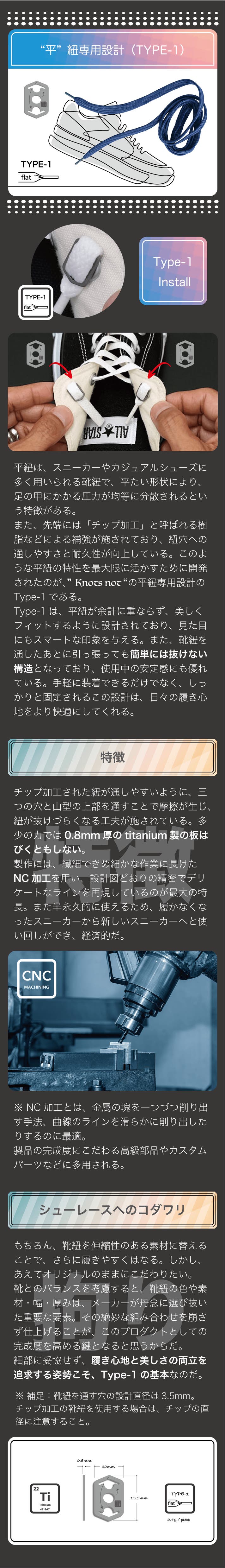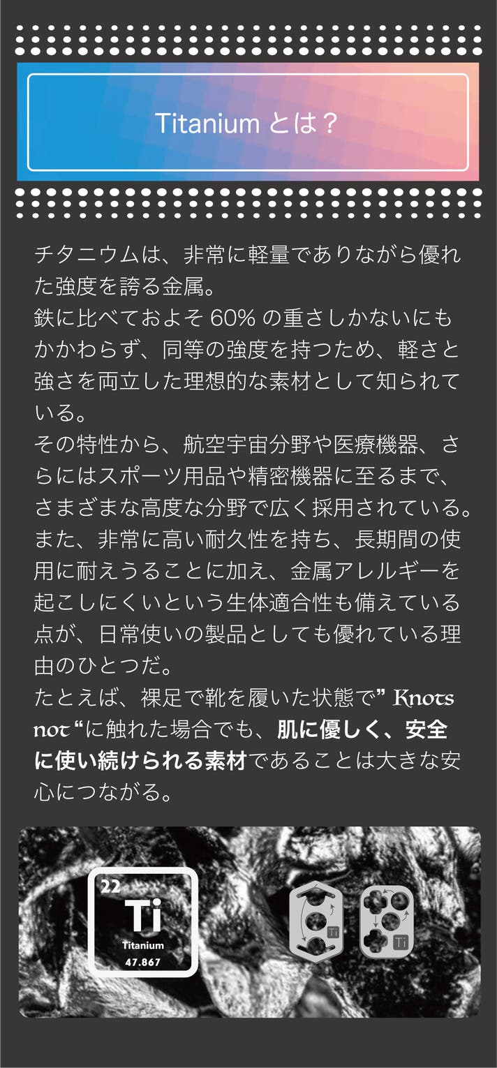 Type-1・Type-2ともに、本体はチタニウム製のため欠けたり曲がったりしにくく、紐が抜けにくく緩みにくい構造です。