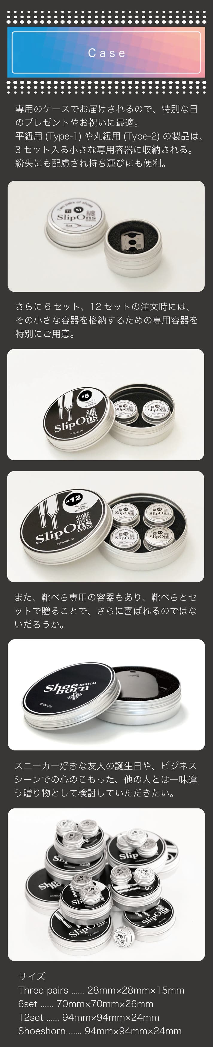 ・Type-1 ひら紐用とType-2 まる紐用シューレースストッパーから12セット選んでください。(ケース付き)