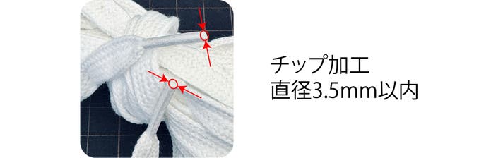 平紐の場合は、紐幅が太いものや、幅が細く厚みのあるタイプでも問題ありません。丸紐も同様に、チップ直径が3.5mm以内であれば通ります。